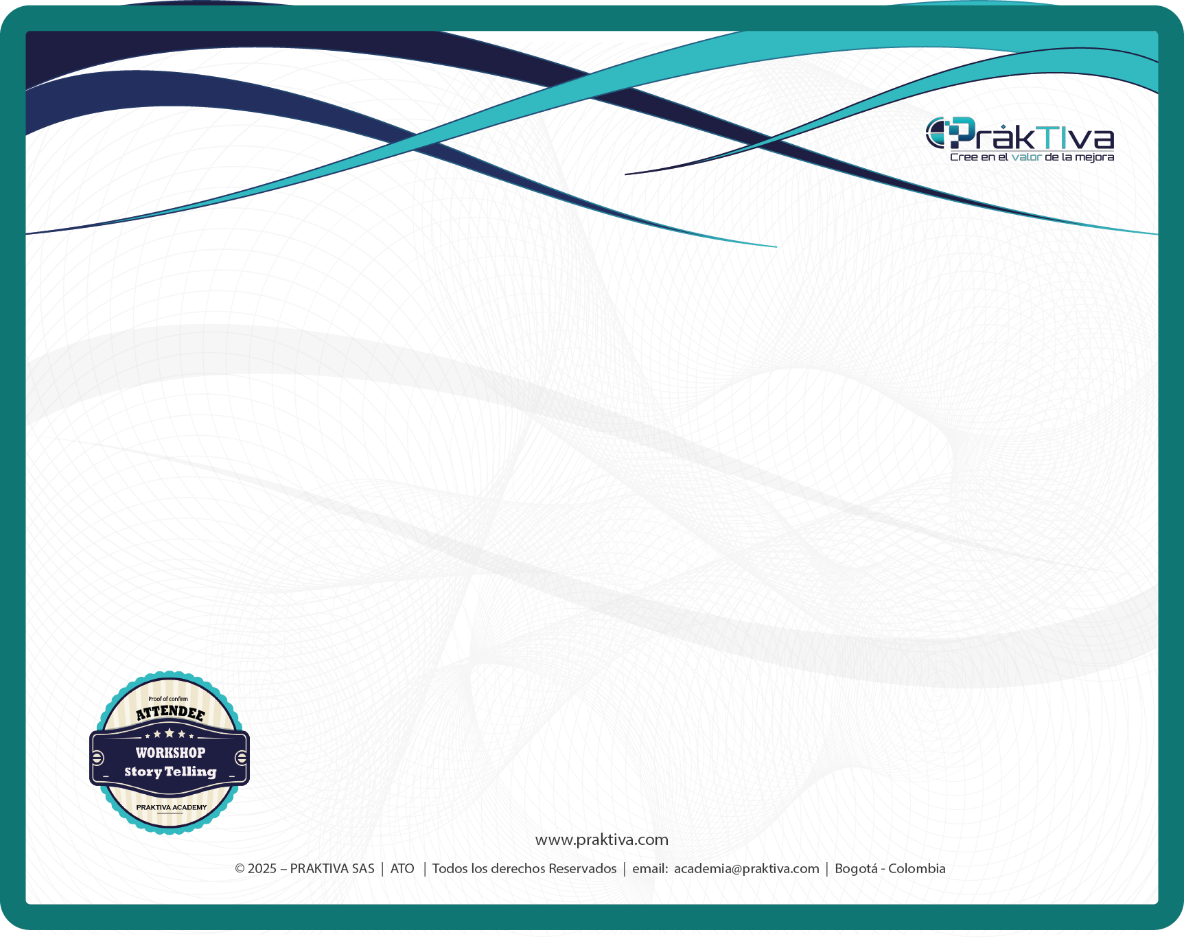 En reconocimiento a su participación activa en el Workshop "Storytelling, el arte de contar historias", práctica que permite contribuir con el fortalecimiento de su contexto profesional y empresarial a través de relatos poderosos y la alineación de mensaje-audiencia-objetivo en cada interacción . Workshop realizado durante 16horas.